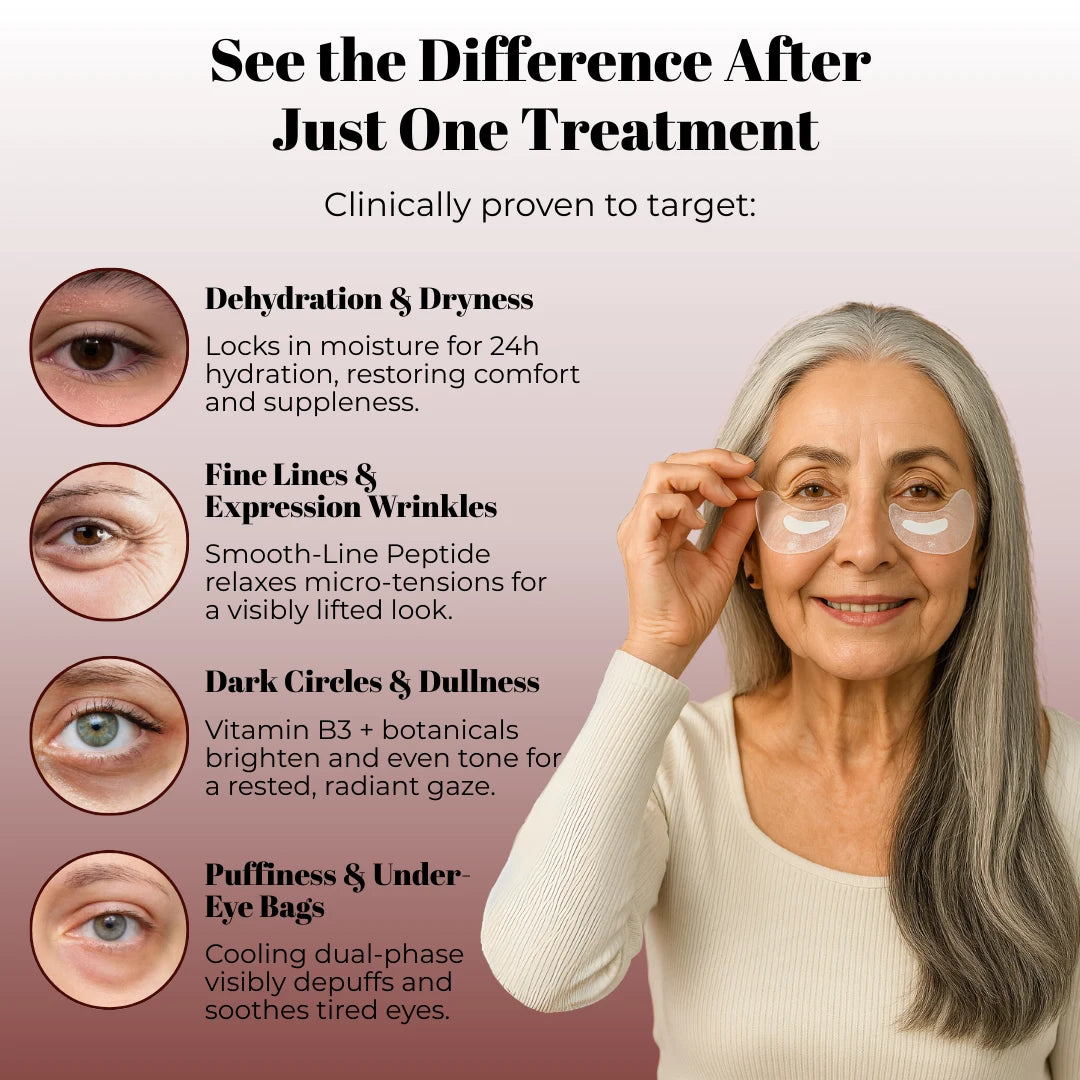 The dry patch dissolves into the essence mask, driving Collagen, Hyaluronic Acid, and Multi-Peptides deep into under-eye layers for immediate and lasting lift.